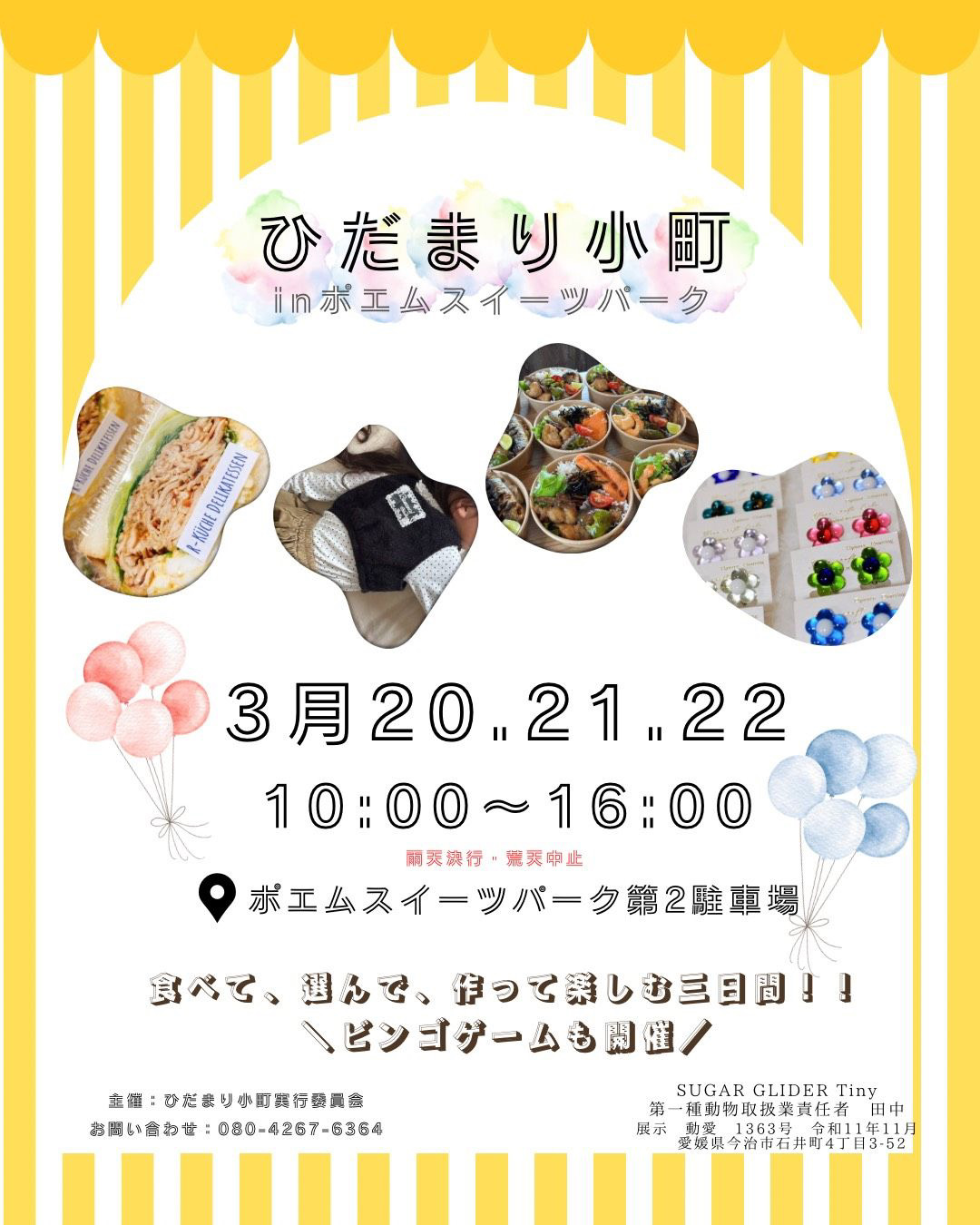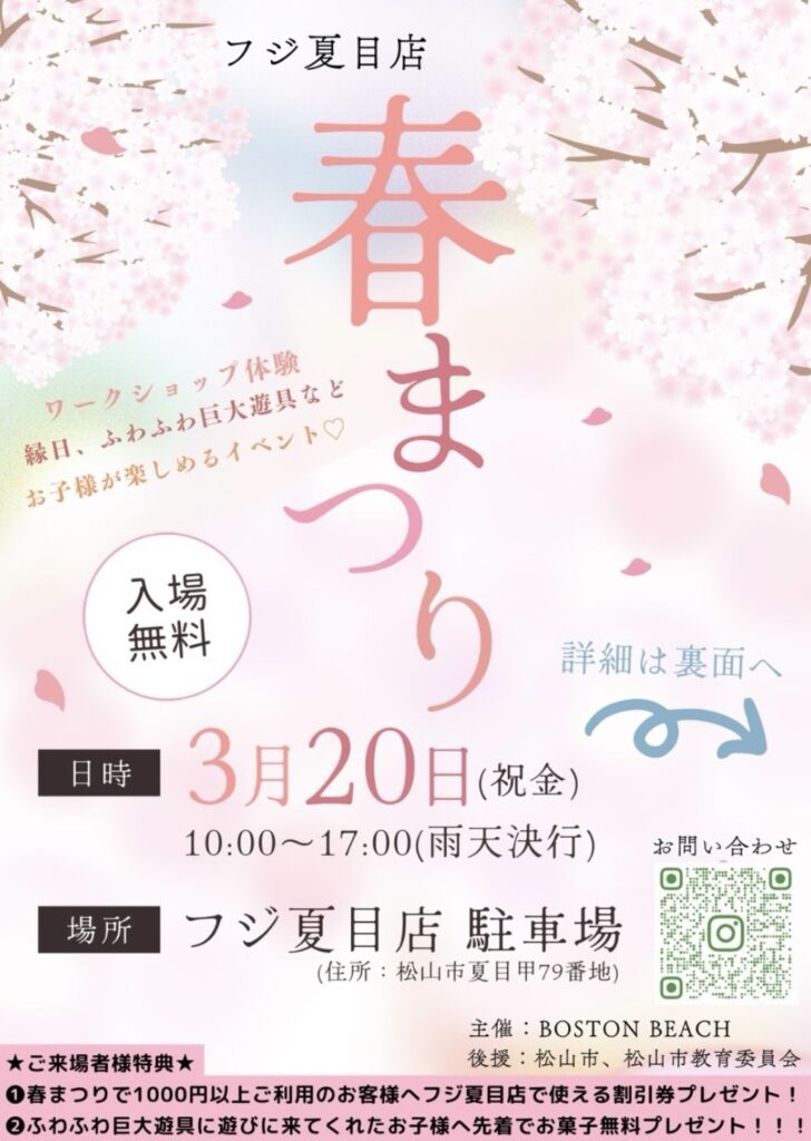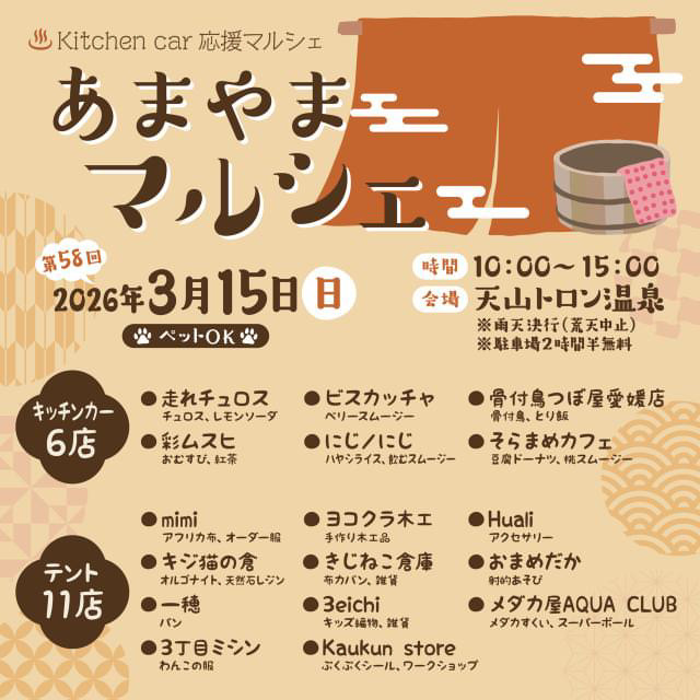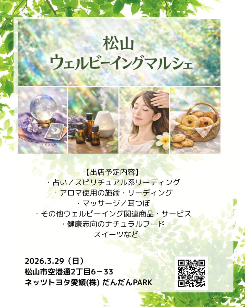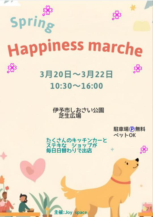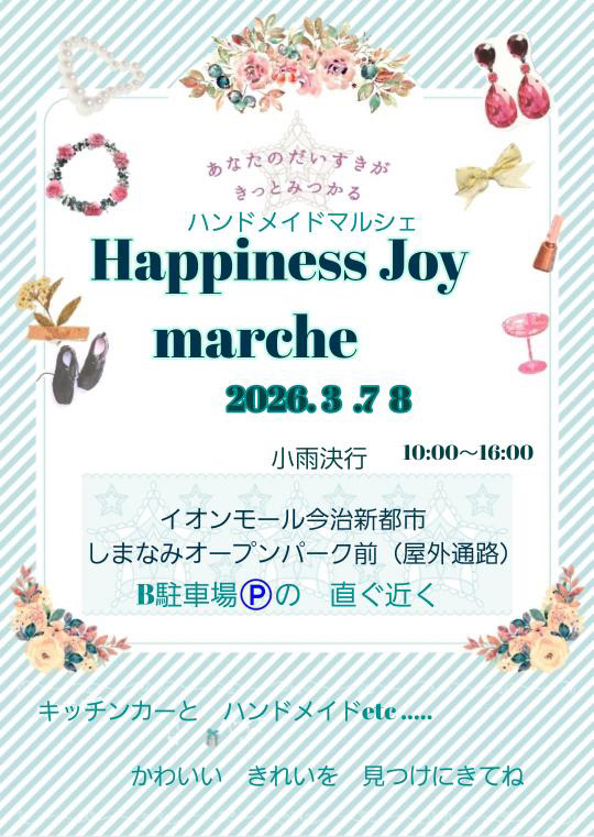 愛媛のマルシェ情報 3月 天候などによって変更や中止になる場合があります。ご注意ください。 1日 日曜日 Happiness Joy marche de rue 開催場所トイザらス前 屋内通路 (松山市) 開催期間2月28日(土) 3月 1日(日) 開催時間10:30〜16:00 サイトInstagram 地図map 7日 土曜日 Happiness Joy marche 開催場所イオンモール今治新都市 しまなみオープンパーク (今治市) 開催期間3月7日(土) 3月8日(日) 開催時間10:00〜16:00 サイトInstagram 地図map 8日 日曜日 Happiness Joy marche 開催場所イオンモール今治新都市 しまなみオープンパーク (今治市) 開催期間3月7日(土) 3月8日(日) 開催時間10:00〜16:00 サイトInstagram 地図map まるまるまるしぇ 開催場所西条市 ホテル玉の家 駐車場 開催期間3月8日(日) 開催時間10:30〜14:30 サイトInstagram 地図map 15日 日曜日 あまやまマルシェ 開催場所天山トロン温泉 (松山市) 開催期間3月15日(日) 開催時間10:00〜15:00 サイトInstagram 地図map 17日 火曜日 美マルシェ 開催場所時地人 - JIJIJIN Matsuyama (砥部町) 開催期間3月17日(火) 開催時間10:30〜16:00 サイトInstagram 地図map 20日 金曜日 フジ夏目店 春まつり 開催場所フジ夏目店 駐車場 (松山市) 開催期間3月20日(金) 開催時間10:00〜17:00 サイトInstagram 地図map Happiness marche 開催場所しおさい公園 芝生広場 (伊予市) 開催期間3月20日(金) 3月21日(土) 3月22日(日) 開催時間10:30〜16:00 サイトInstagram 地図map ひだまり小町 in ポエムスイーツパーク 開催場所母恵夢スイーツパーク (東温市) 開催期間3月20日(金) 3月21日(土) 3月22日(日) 開催時間10:00〜16:00 サイトInstagram 地図map 21日 土曜日 熊野の杜のマルシェ 開催場所新宮小中学校 グラウンド (四国中央市) 開催期間3月21日(土) 開催時間10:00〜15:00 サイトInstagram 地図map Happiness marche 開催場所しおさい公園 芝生広場 (伊予市) 開催期間3月20日(金) 3月21日(土) 3月22日(日) 開催時間10:30〜16:00 サイトInstagram 地図map ひだまり小町 in ポエムスイーツパーク 開催場所母恵夢スイーツパーク (東温市) 開催期間3月20日(金) 3月21日(土) 3月22日(日) 開催時間10:00〜16:00 サイトInstagram 地図map 22日 日曜日 Happiness marche 開催場所しおさい公園 芝生広場 (伊予市) 開催期間3月20日(金) 3月21日(土) 3月22日(日) 開催時間10:30〜16:00 サイトInstagram 地図map ひだまり小町 in ポエムスイーツパーク 開催場所母恵夢スイーツパーク (東温市) 開催期間3月20日(金) 3月21日(土) 3月22日(日) 開催時間10:00〜16:00 サイトInstagram 地図map 29日 日曜日 松山ウェルビーイングマルシェ 開催場所ネッツトヨタ愛媛(株)だんだんPARK (松山市) 開催期間3月29日(日) 開催時間10:00〜17:00 サイトInstagram 地図map